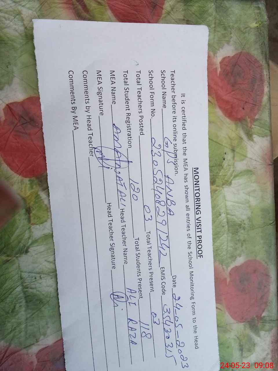 | Attendance Register | Head Teacher | MEA with School | Visit Proof |