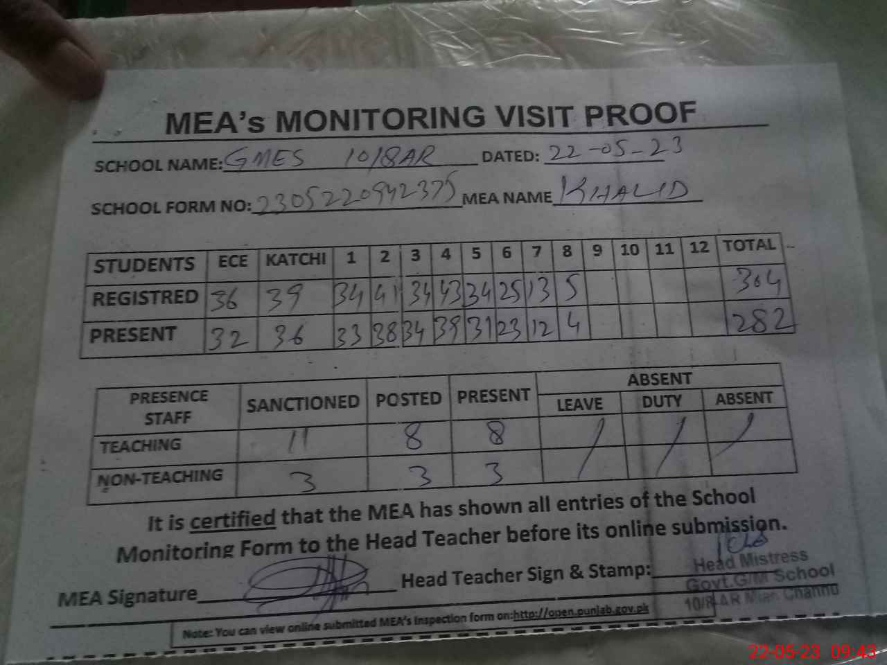 | Monitoring Date: 22-05-2023 | Start Time: 22-05-2023 08:09 AM | End Time: 22-05-2023 09:50 AM | Name of MEA: Kh**** Me**** | |