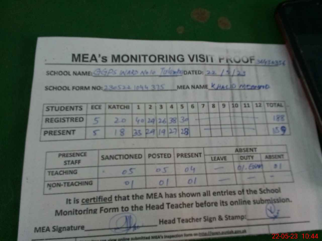 | Attendance Register | Head Teacher | MEA with School | Visit Proof |