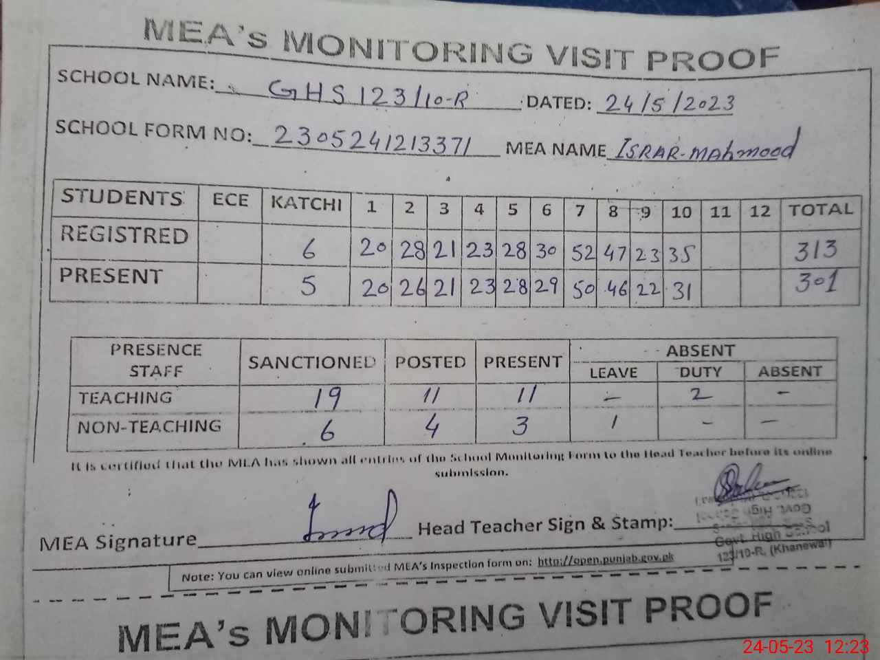 | Attendance Register | Head Teacher | MEA with School | Visit Proof |