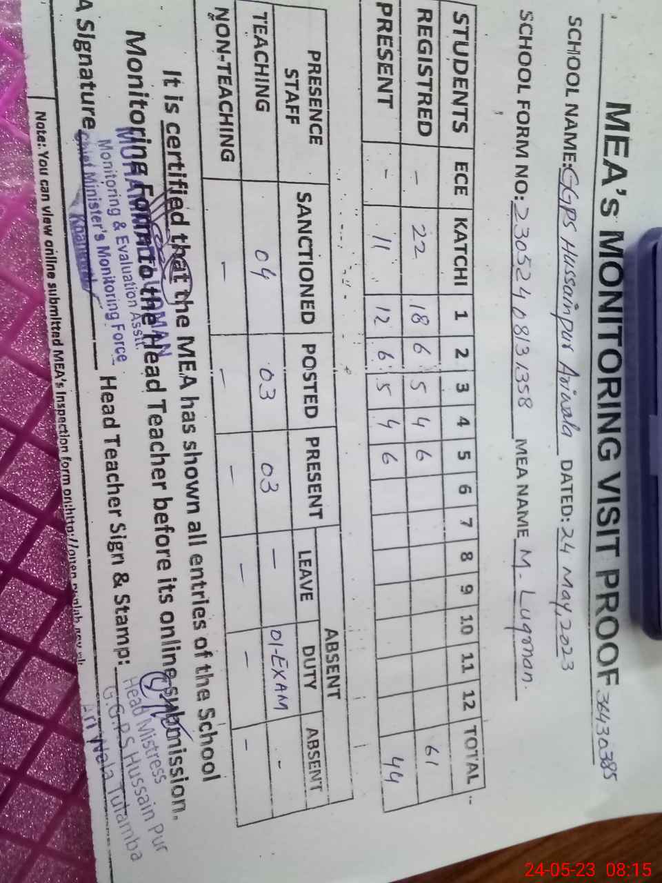 | Attendance Register | Head Teacher | MEA with School | Visit Proof |