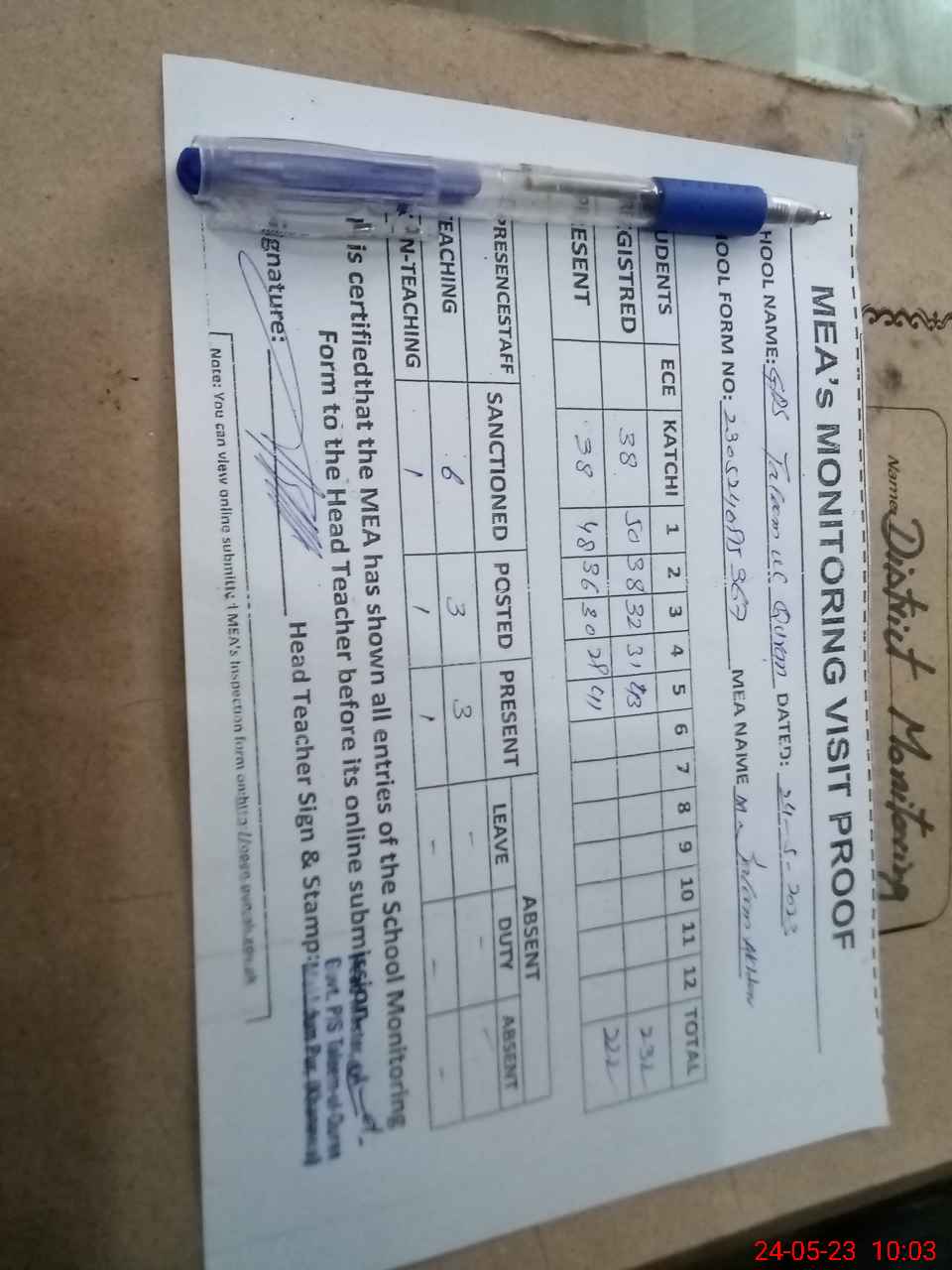 | Attendance Register | Head Teacher | MEA with School | Visit Proof |