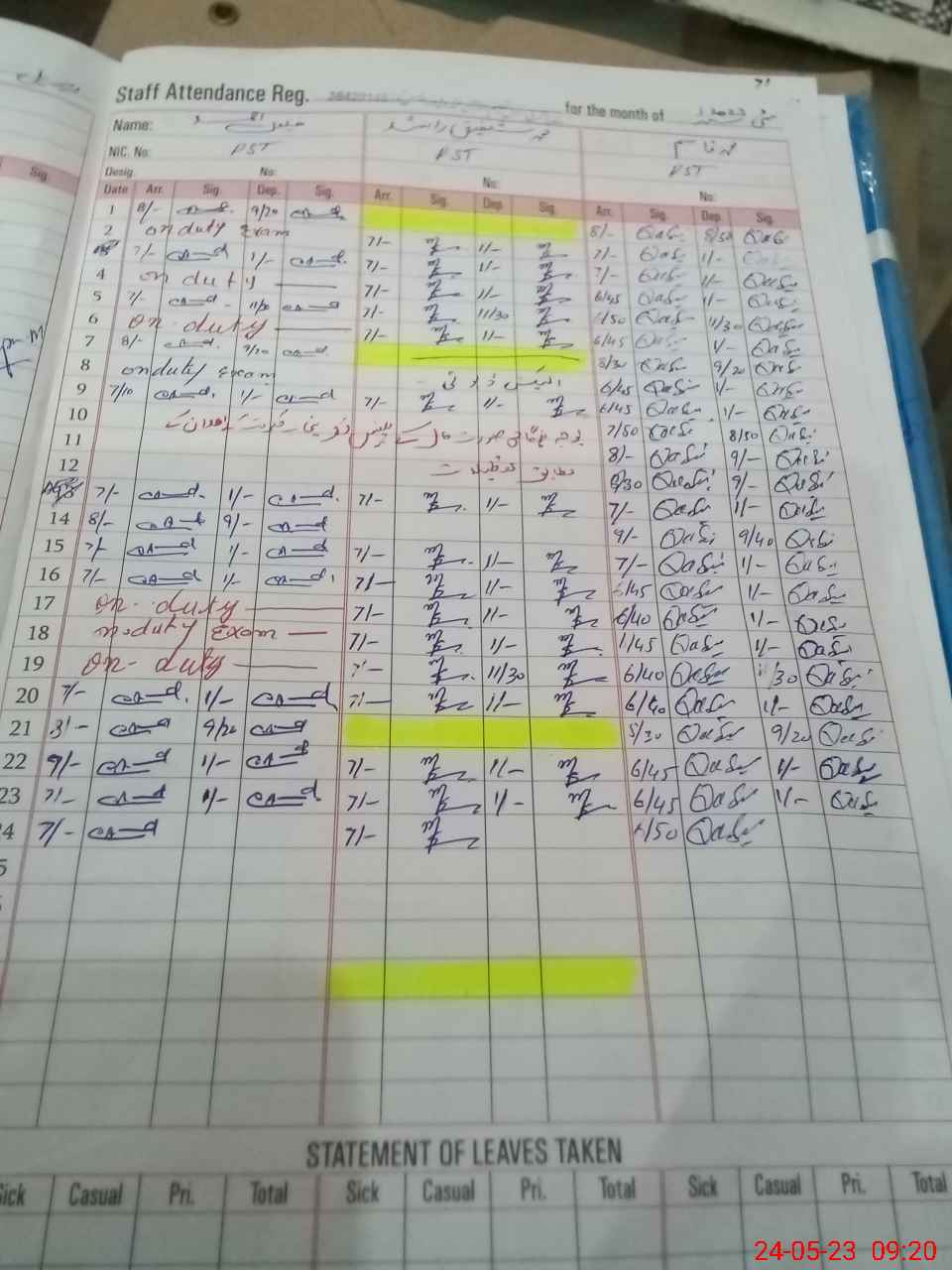 | CNIC | Full Name | Designation | R/C | Absence During Last Calender Month |