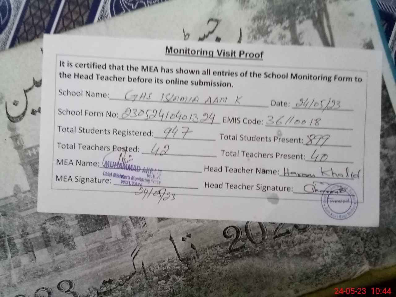 | Attendance Register | Head Teacher | MEA with School | Visit Proof |