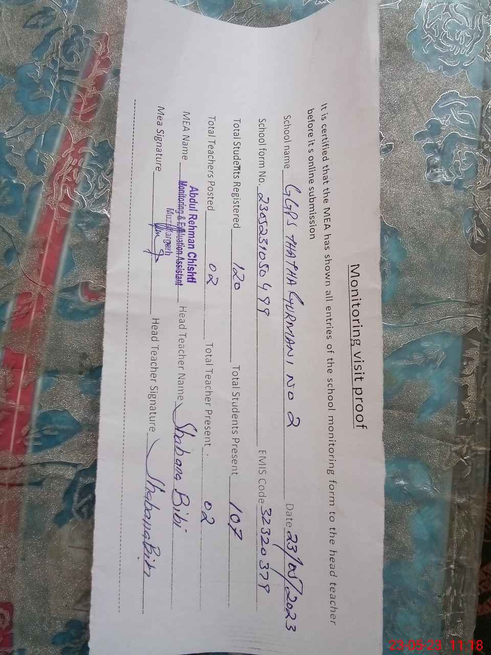 | Attendance Register | Head Teacher | MEA with School | Visit Proof |