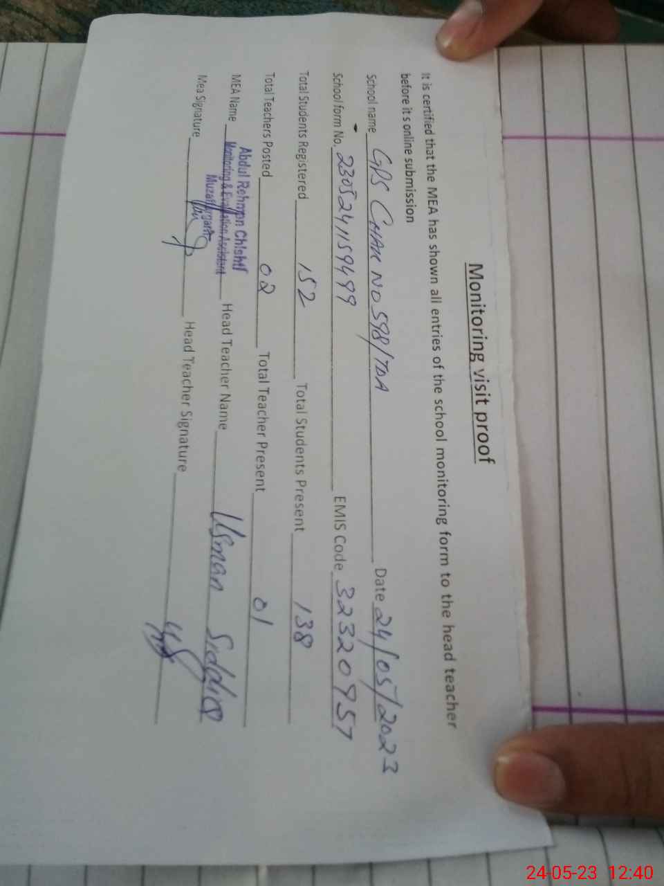 | Attendance Register | Head Teacher | MEA with School | Visit Proof |