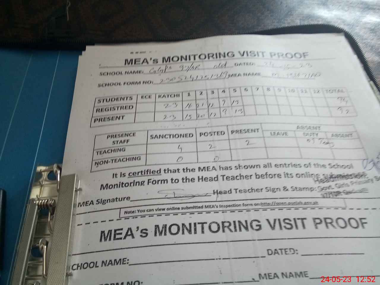 | Attendance Register | Head Teacher | MEA with School | Visit Proof |