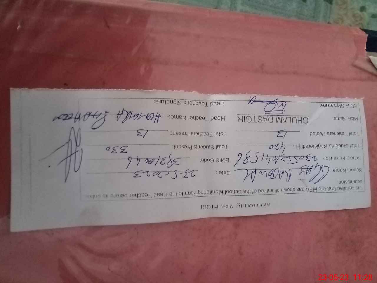 | Attendance Register | Head Teacher | MEA with School | Visit Proof |