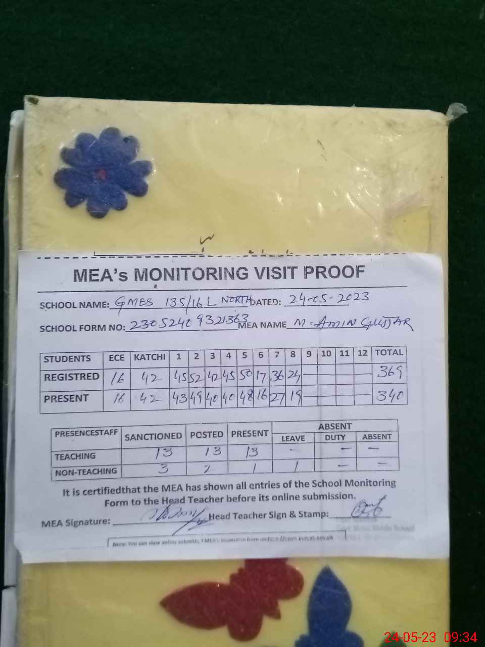 | Attendance Register | Head Teacher | MEA with School | Visit Proof |