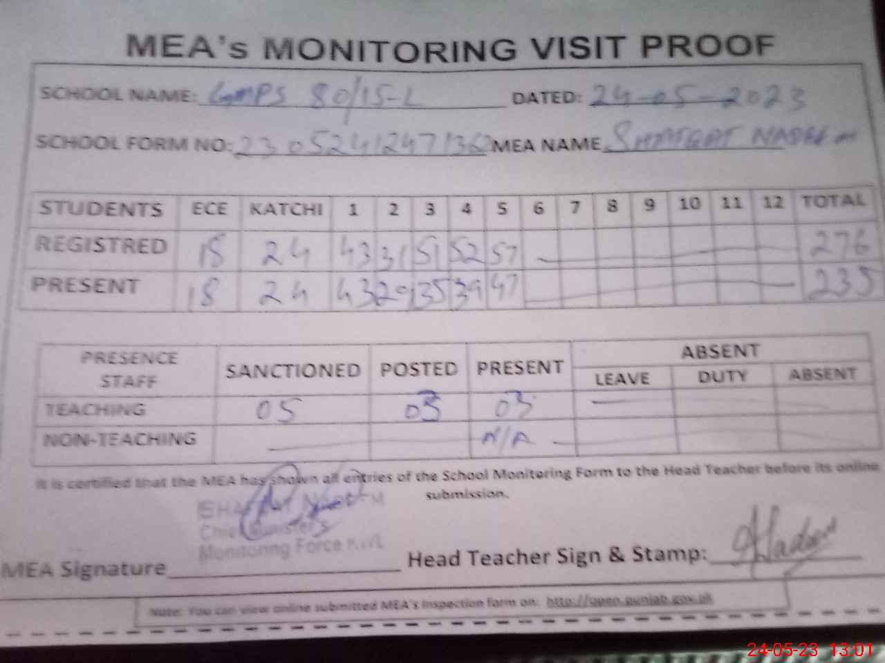 | Attendance Register | Head Teacher | MEA with School | Visit Proof |