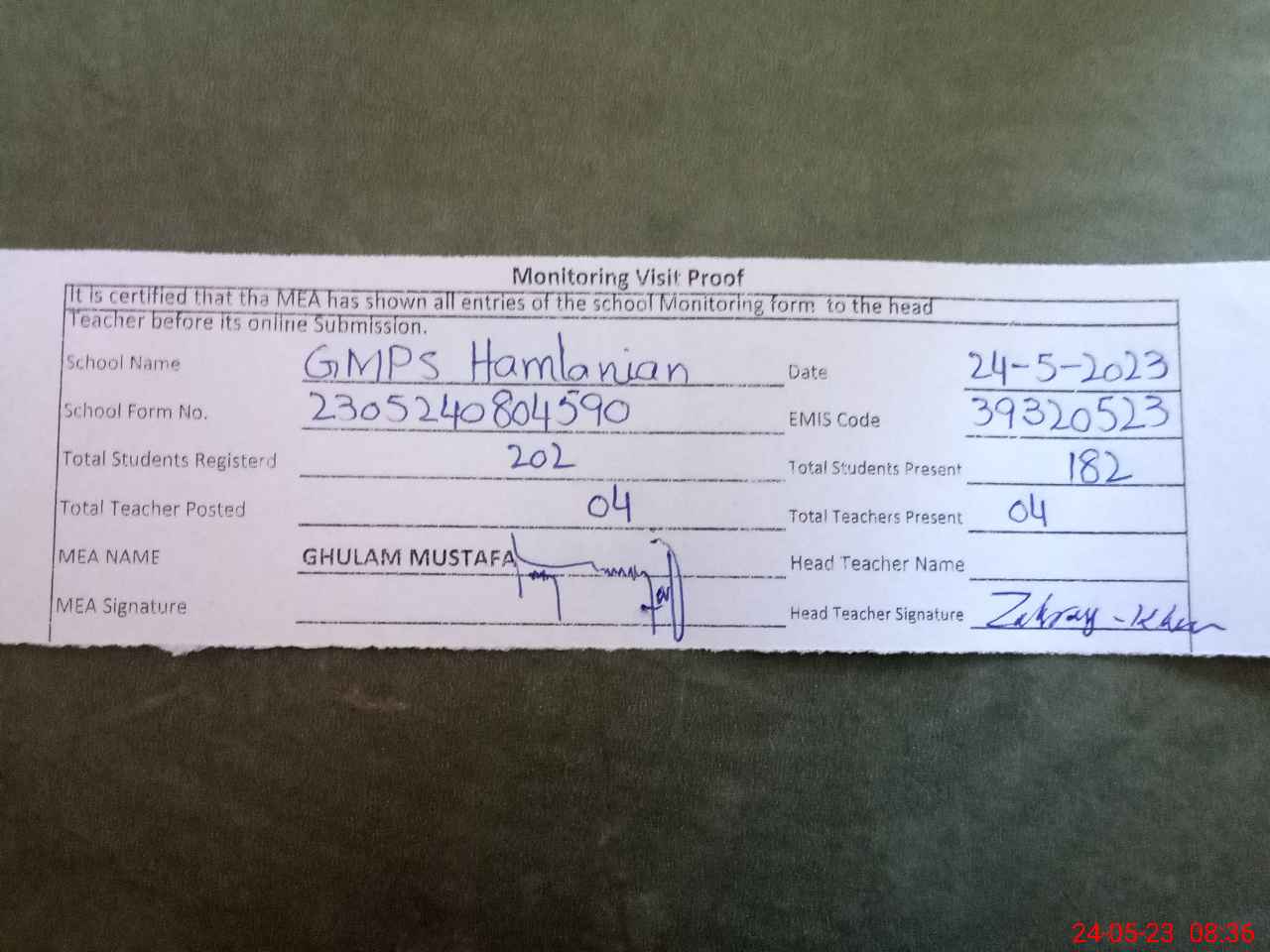 | EMIS Code: 39320523 | Name of School: GMPS HAMLANIA | |||