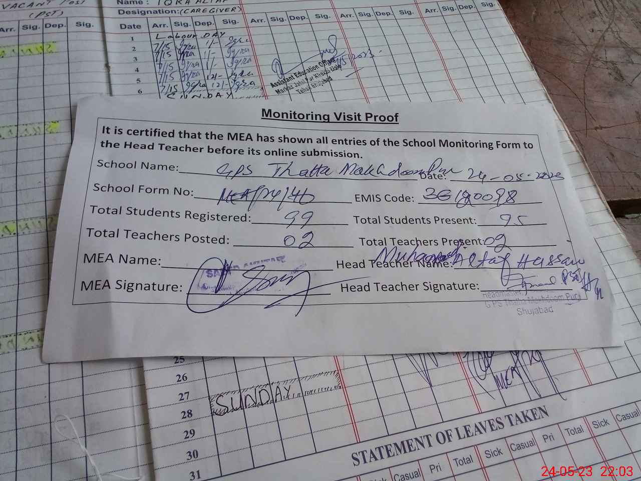 | Attendance Register | Head Teacher | MEA with School | Visit Proof |