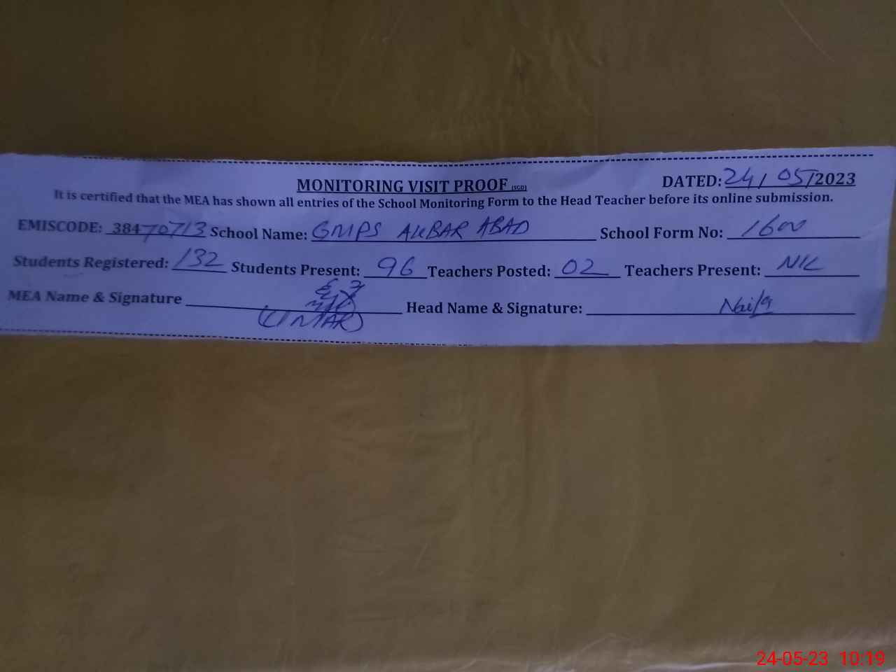 | Attendance Register | Head Teacher | MEA with School | Visit Proof |