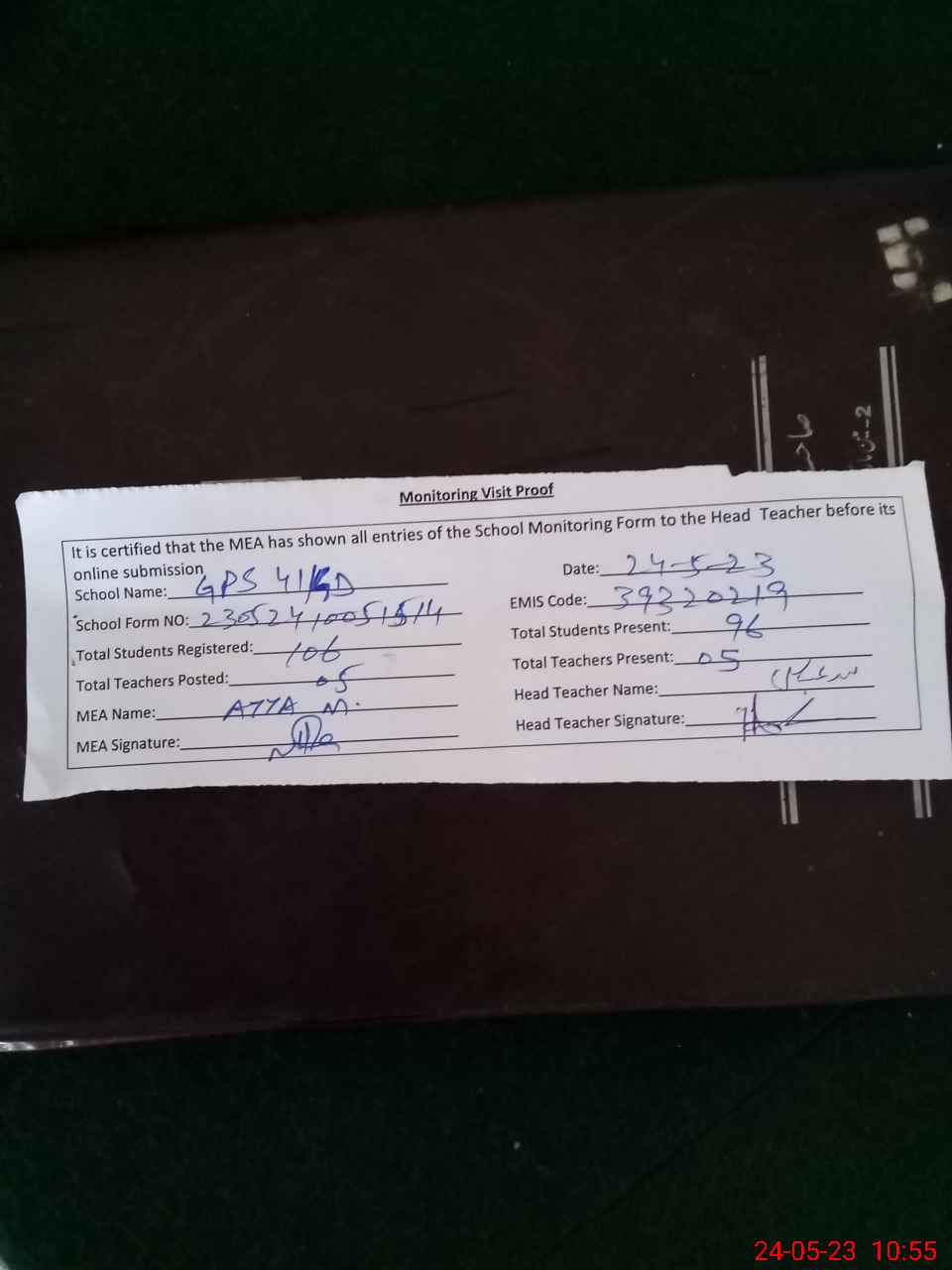 | Attendance Register | Head Teacher | MEA with School | Visit Proof |