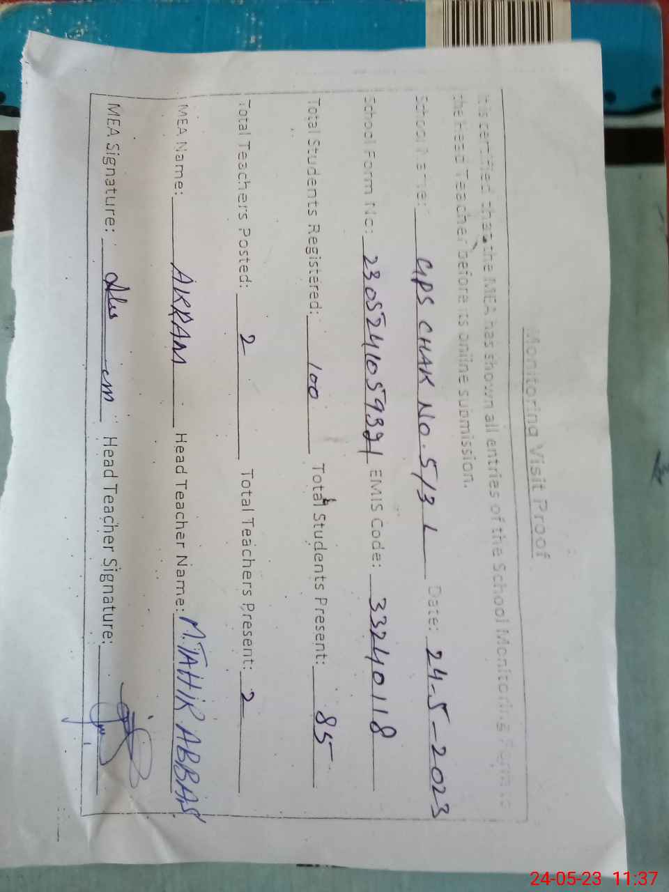 | EMIS Code: 33240118 | Name of School: GPS CHAK NO 5/3 L | |||