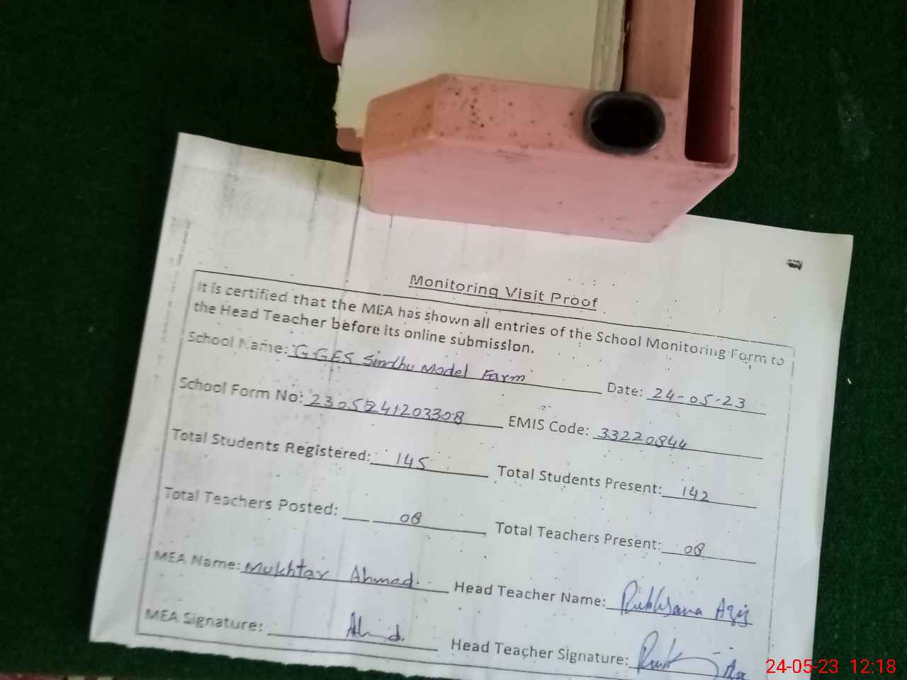 | Attendance Register | Head Teacher | MEA with School | Visit Proof |