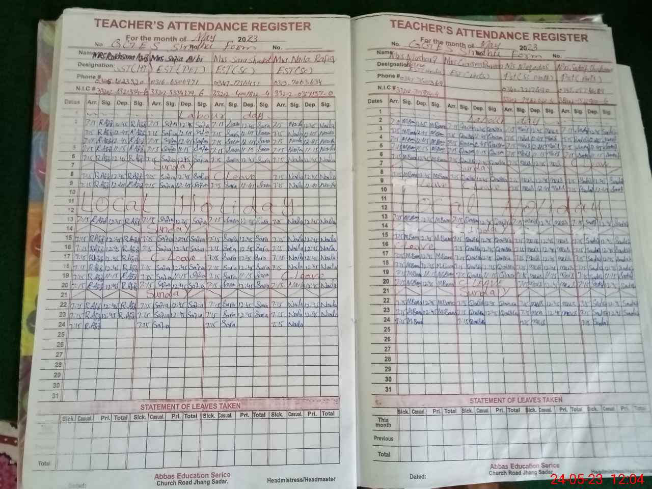 | CNIC | Full Name | Designation | R/C | Absence During Last Calender Month |
