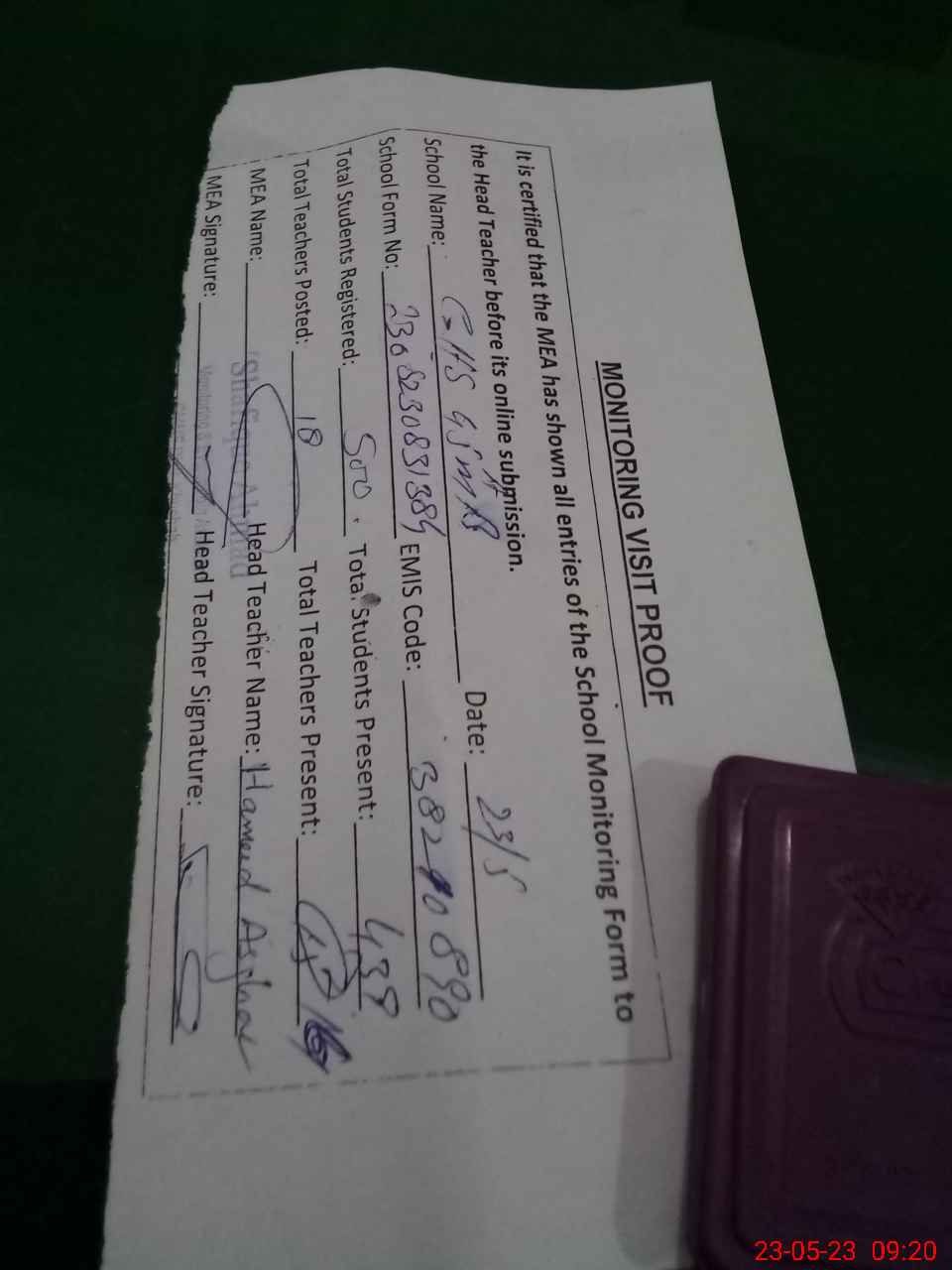| Attendance Register | Head Teacher | MEA with School | Visit Proof |