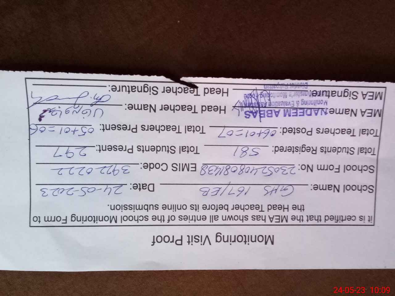 | Attendance Register | Head Teacher | MEA with School | Visit Proof |