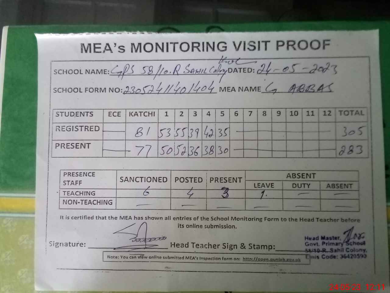 | Attendance Register | Head Teacher | MEA with School | Visit Proof |
