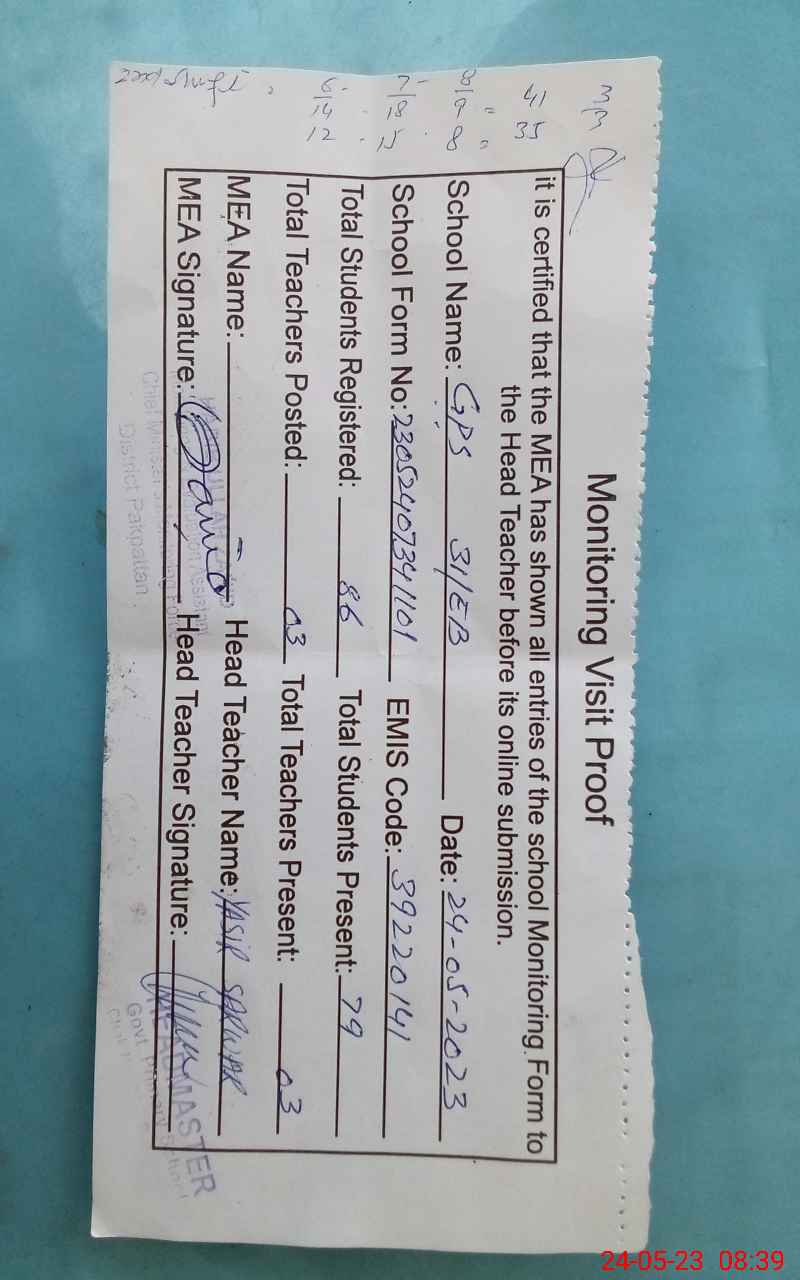 | Attendance Register | Head Teacher | MEA with School | Visit Proof |