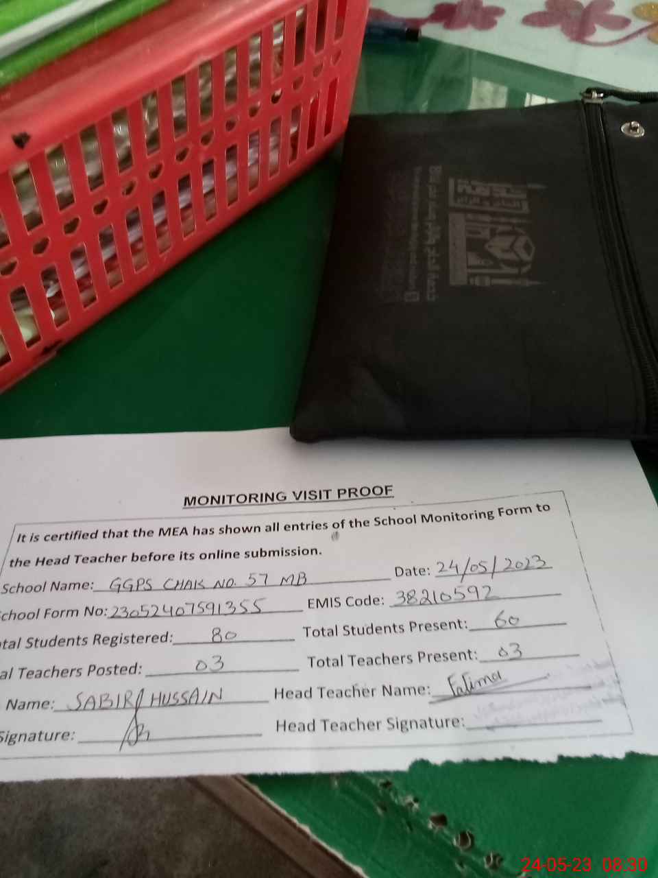 | Attendance Register | Head Teacher | MEA with School | Visit Proof |