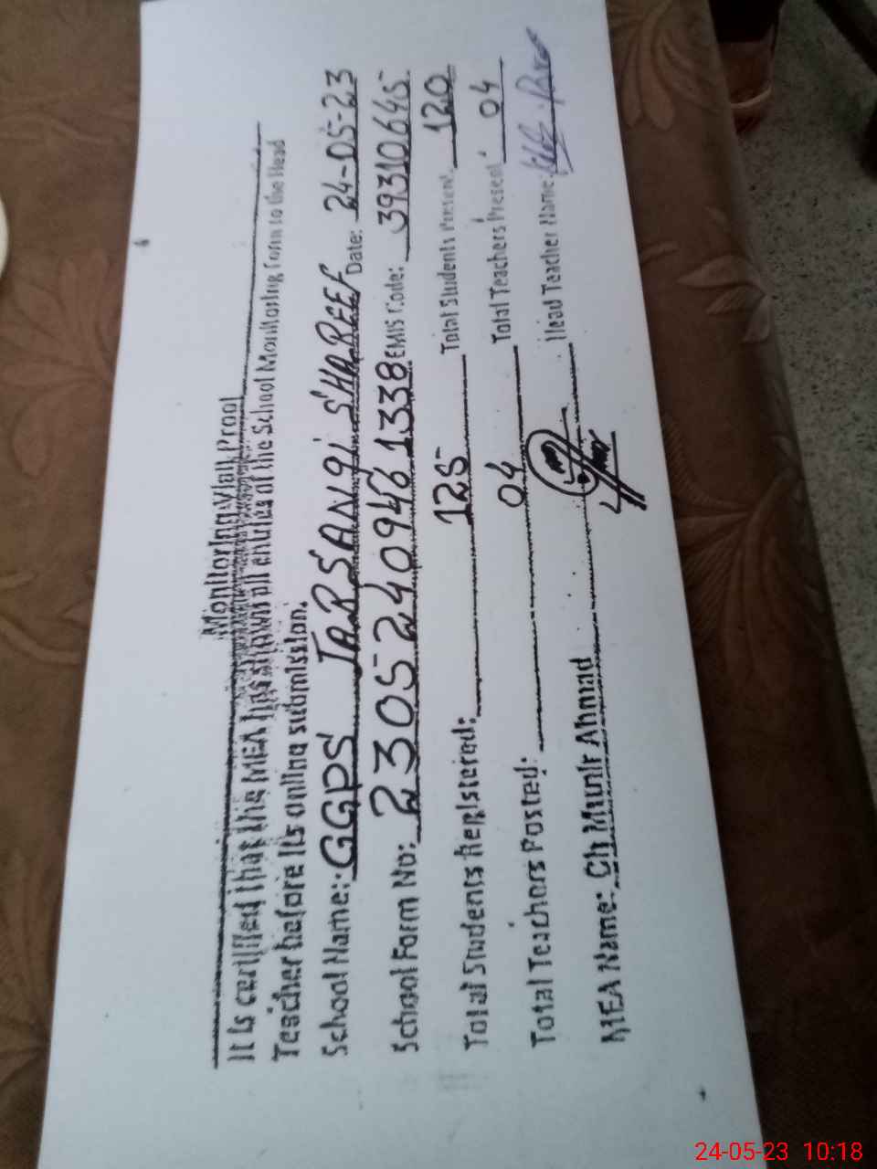 | Name: KH**** PE**** Designation: (School Headmaster's/Headmistress's) PST Phone/Cell Number: 03**** |