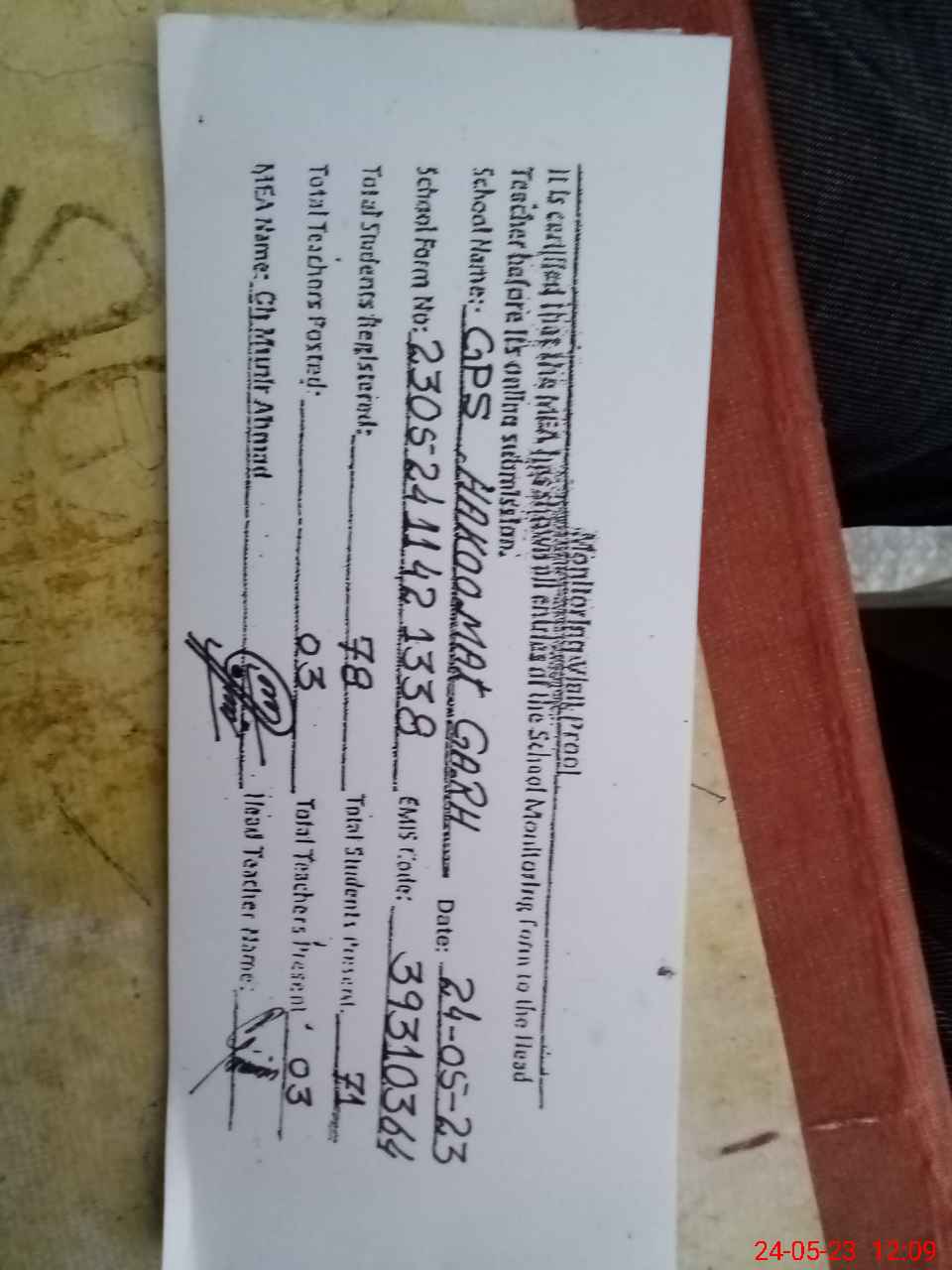 | Attendance Register | Head Teacher | MEA with School | Visit Proof |