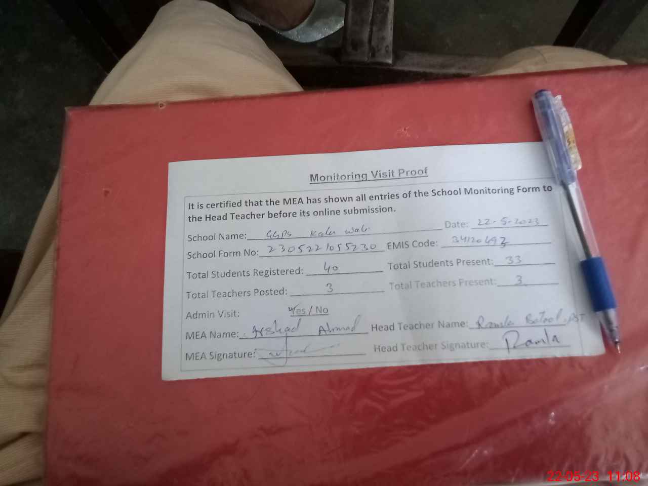 | Attendance Register | Head Teacher | MEA with School | Visit Proof |