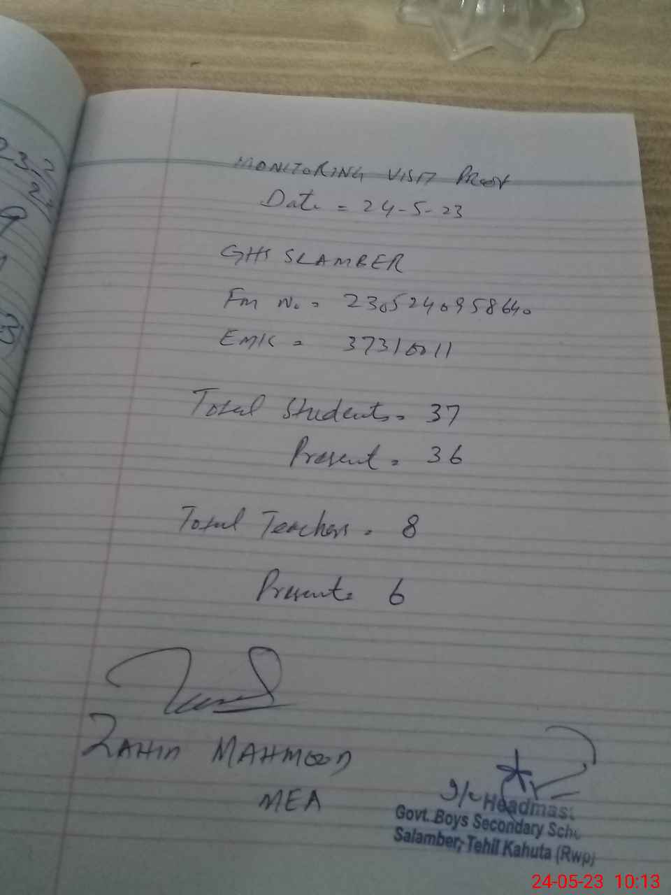 | Attendance Register | Head Teacher | MEA with School | Visit Proof |
