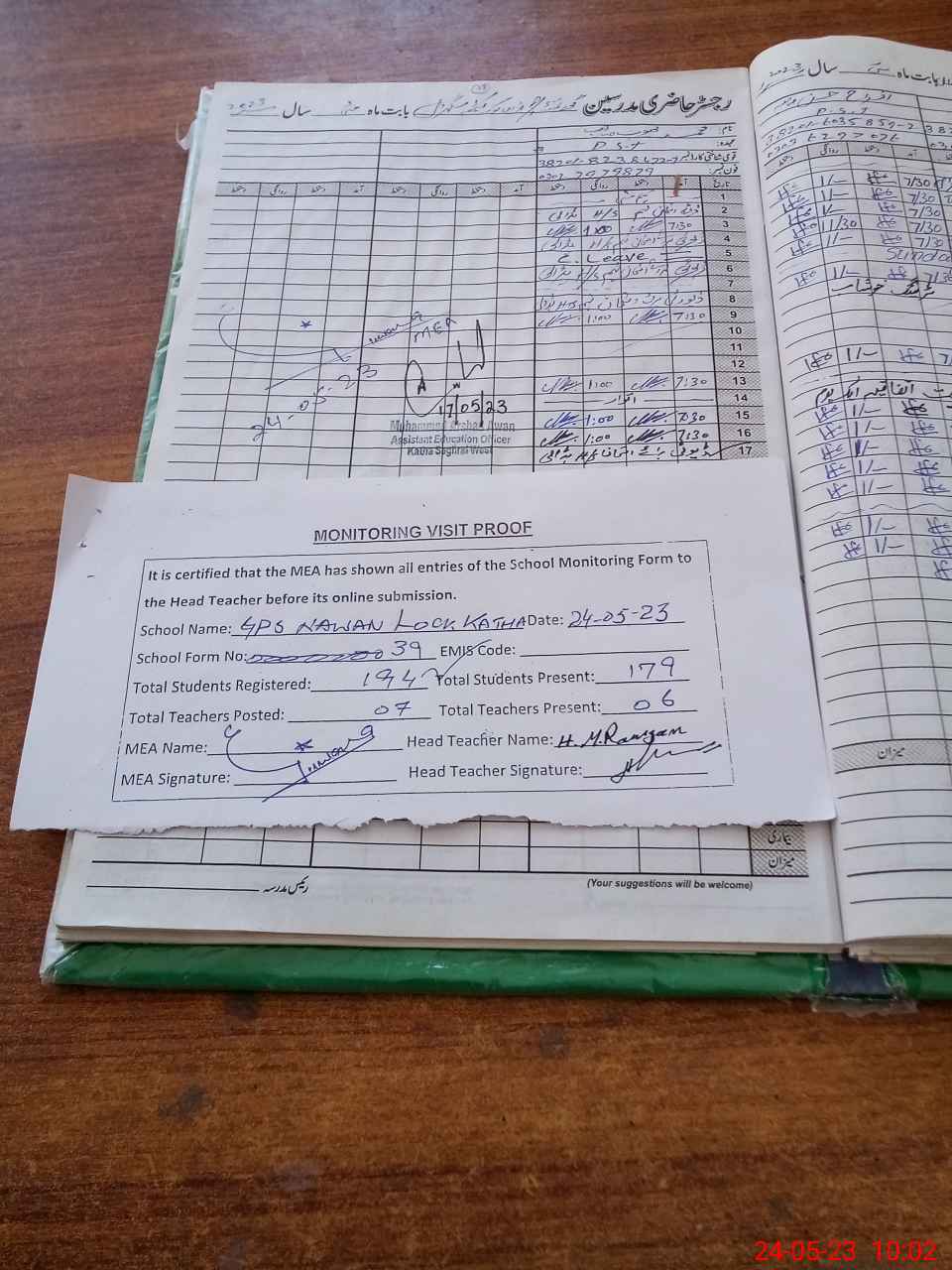 | Attendance Register | Head Teacher | MEA with School | Visit Proof |