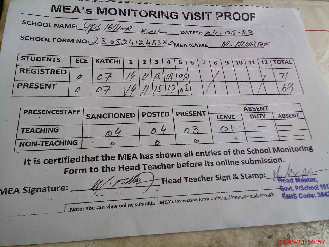 | Attendance Register | Head Teacher | MEA with School | Visit Proof |
