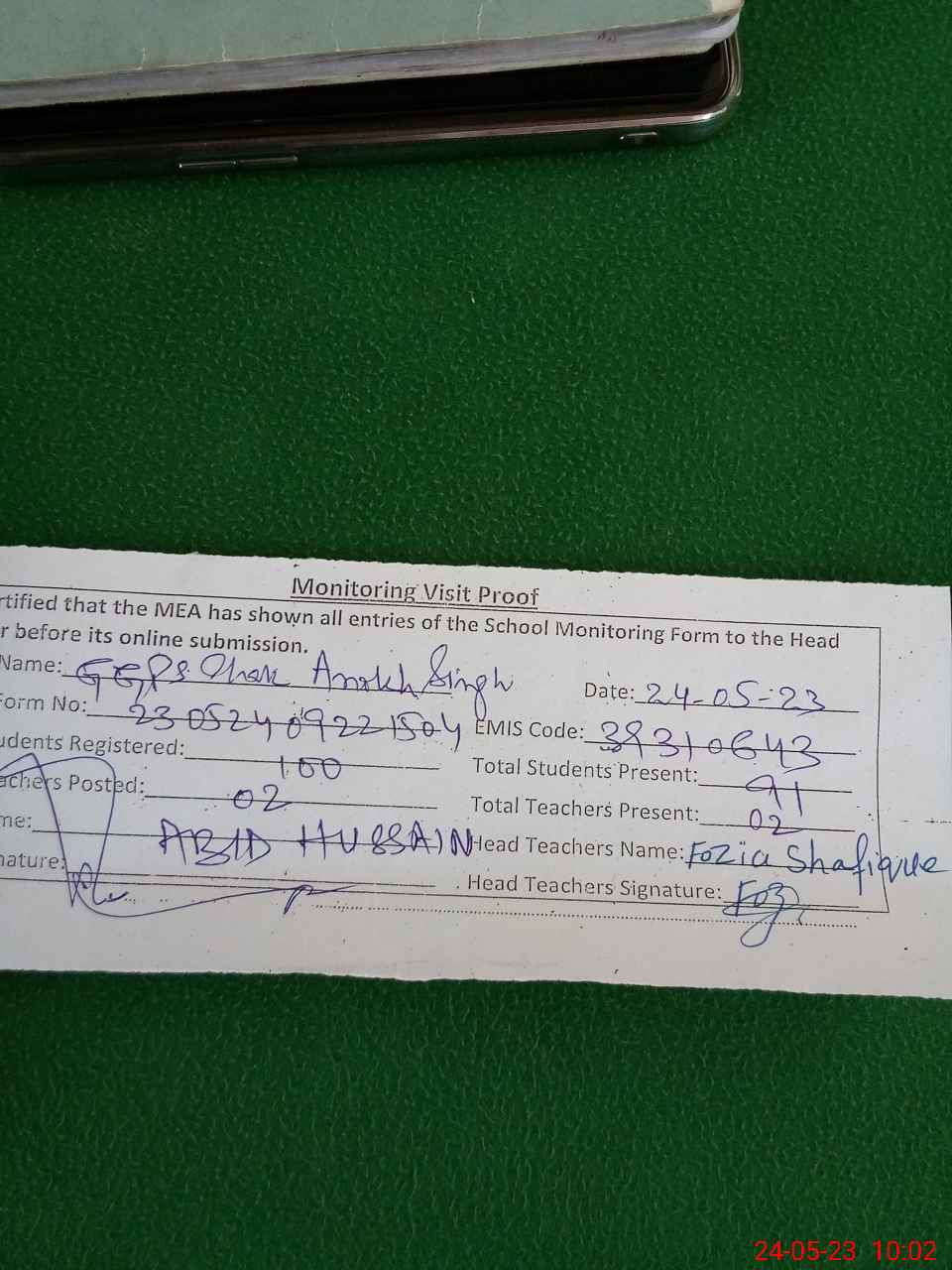 | Attendance Register | Head Teacher | MEA with School | Visit Proof |