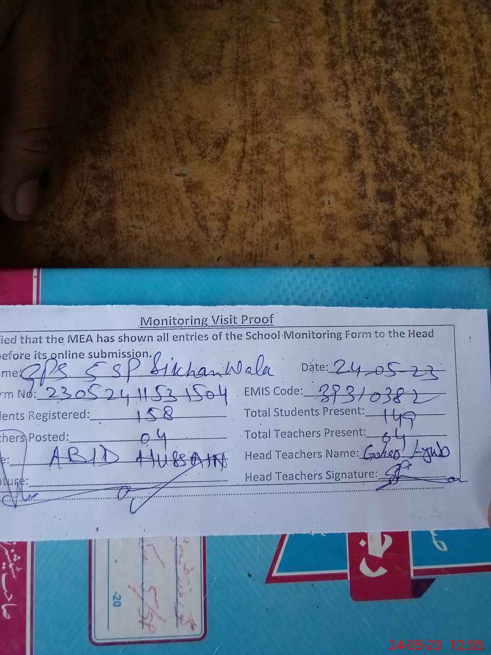 | Attendance Register | Head Teacher | MEA with School | Visit Proof |
