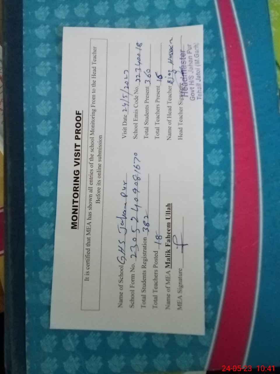 | Attendance Register | Head Teacher | MEA with School | Visit Proof |