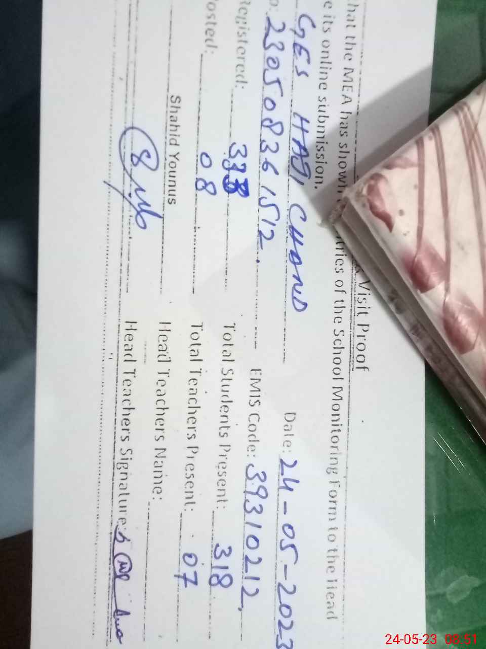 | Attendance Register | Head Teacher | MEA with School | Visit Proof |