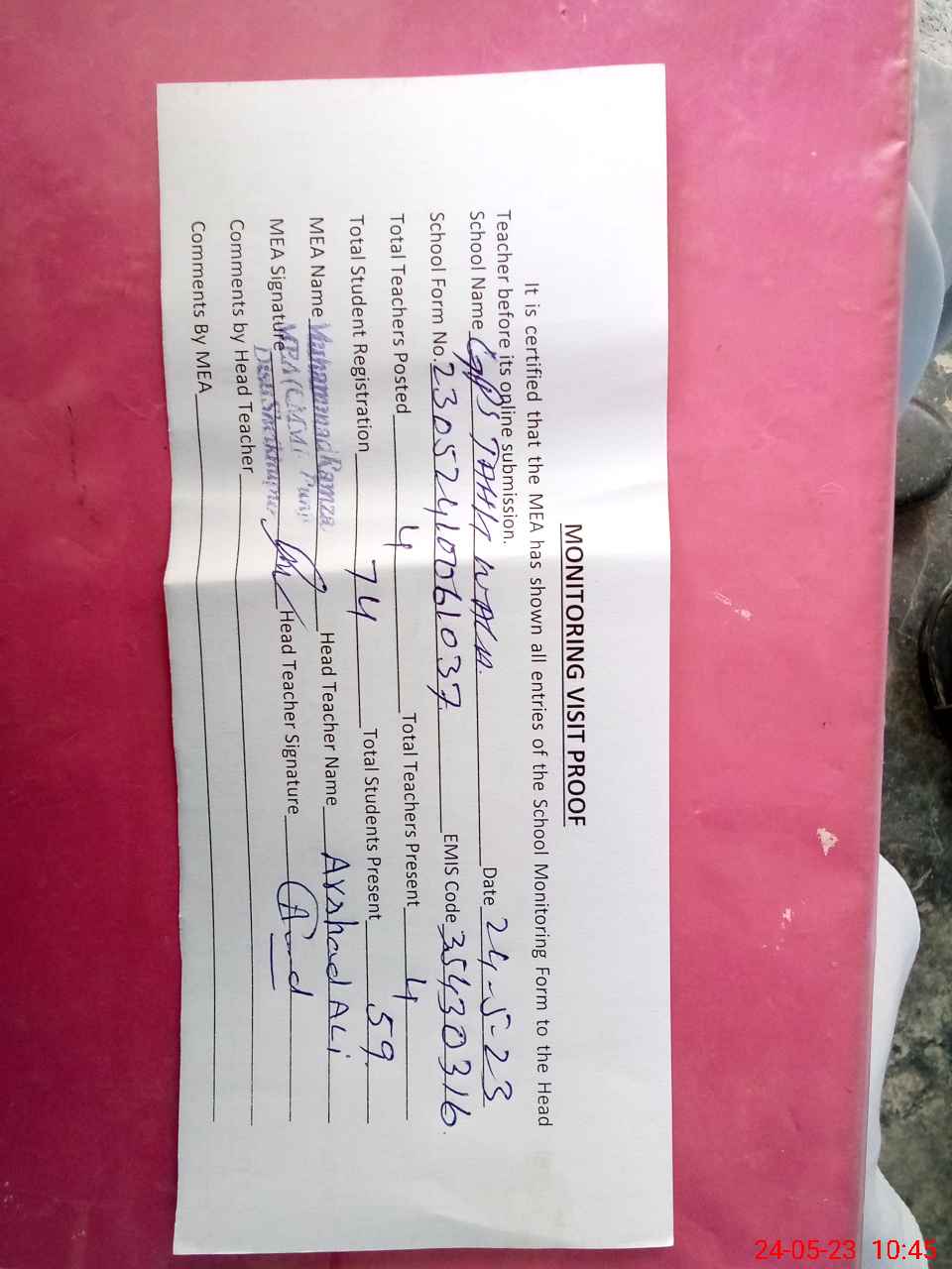 | Attendance Register | Head Teacher | MEA with School | Visit Proof |