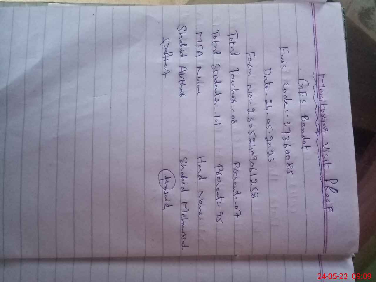 | Attendance Register | Head Teacher | MEA with School | Visit Proof |