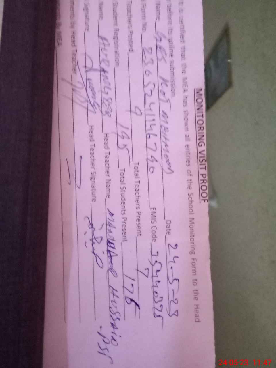 | Attendance Register | Head Teacher | MEA with School | Visit Proof |