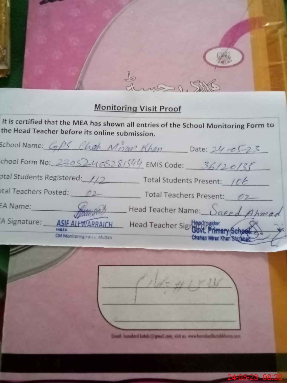 | Attendance Register | Head Teacher | MEA with School | Visit Proof |