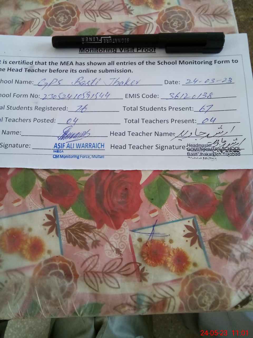 | Name: Ar**** Ja**** Designation: (School Headmaster's/Headmistress's) HEADMASTER Phone/Cell Number: 03**** |