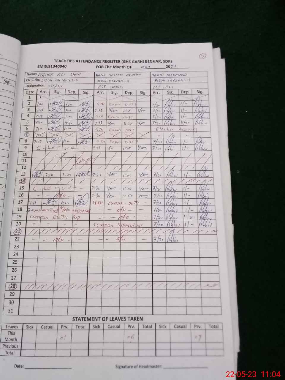| CNIC | Full Name | Designation | R/C | Absence during last cal. month |