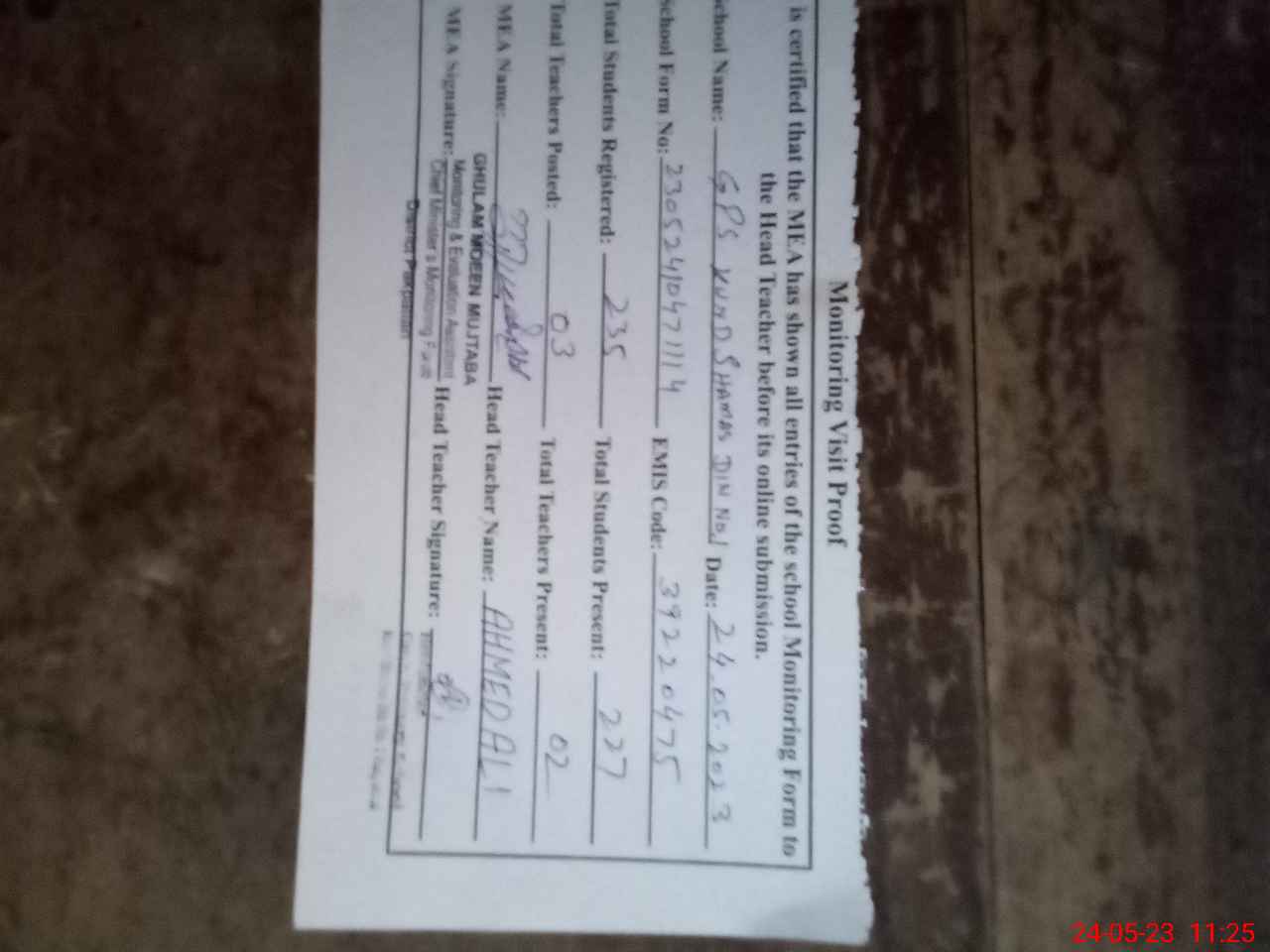 | Attendance Register | Head Teacher | MEA with School | Visit Proof |