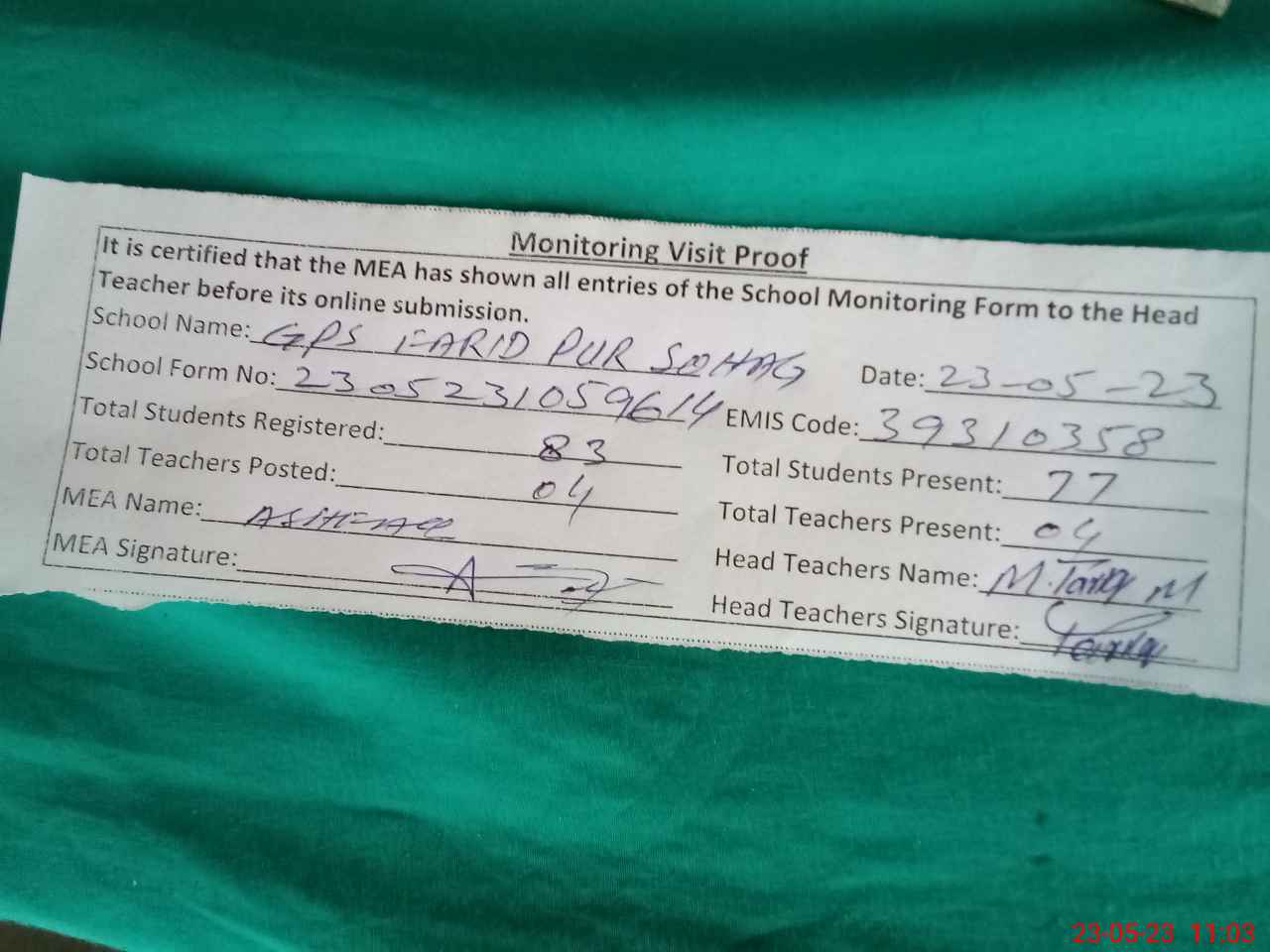 | Attendance Register | Head Teacher | MEA with School | Visit Proof |