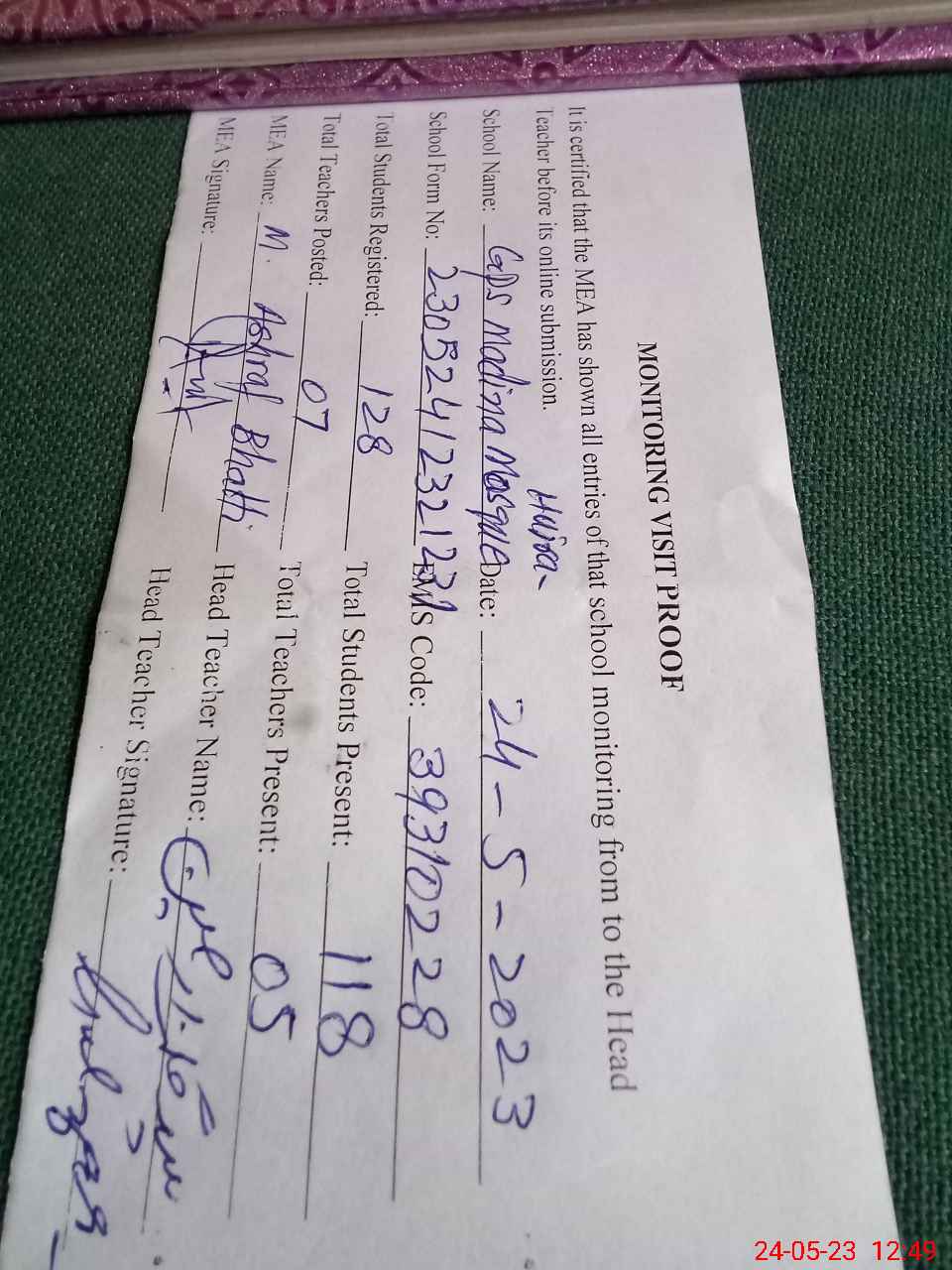 | Certified that this School was Inspected by the Undersigned MEA/DMO Today and the Information Stated Above is as Per Record. | |||||