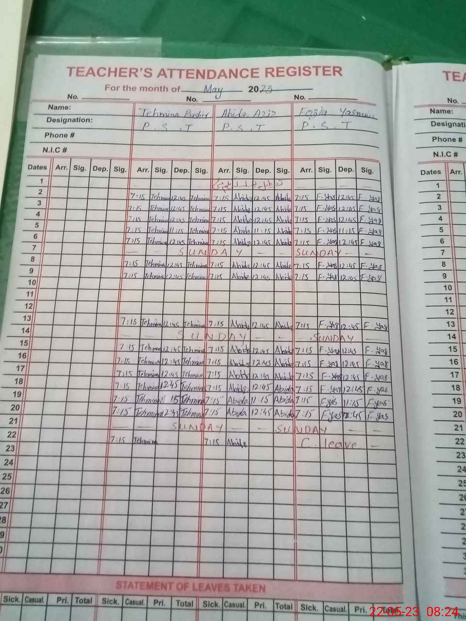| CNIC | Full Name | Designation | R/C | Absence During Last Calender Month |