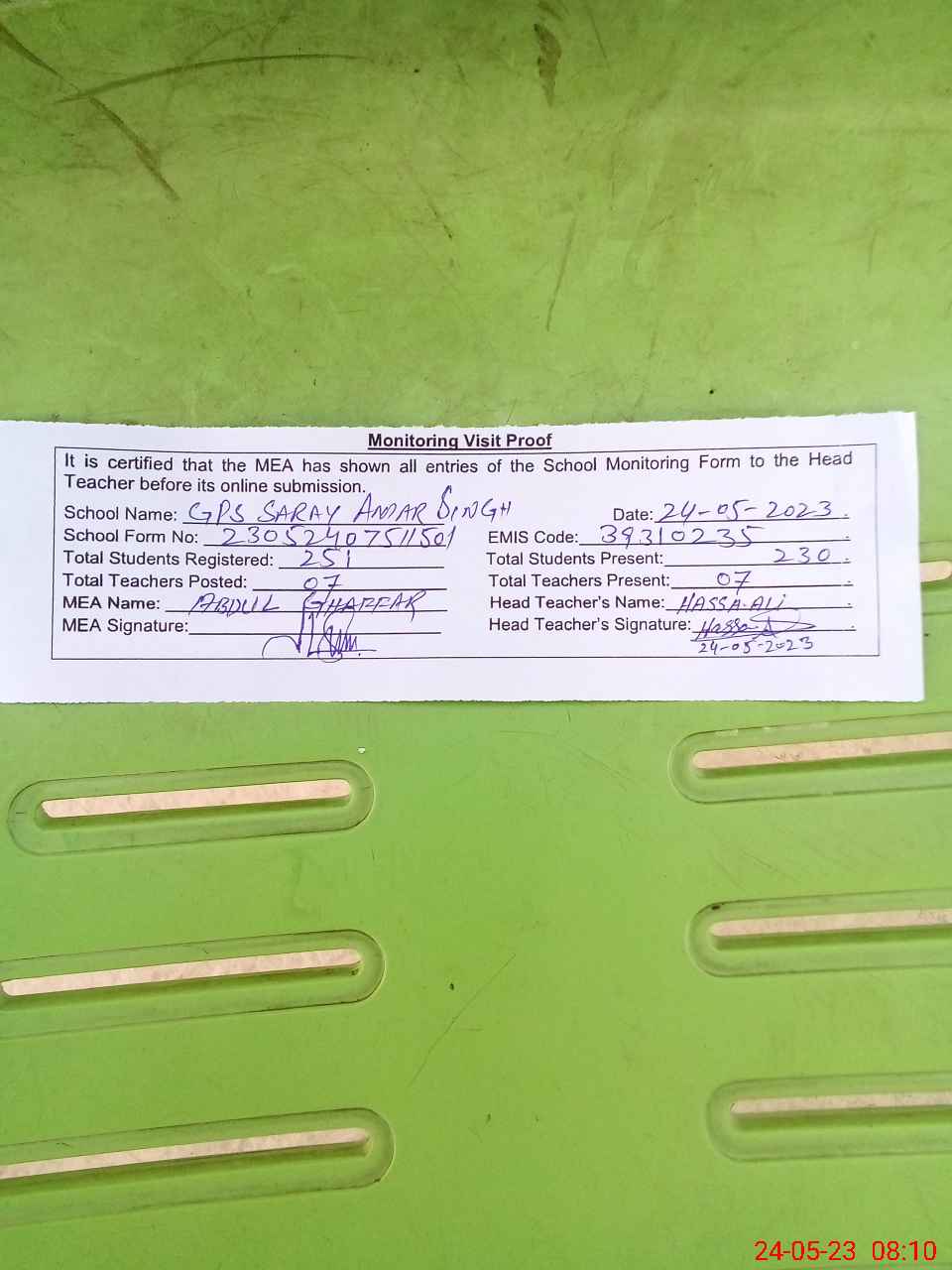 | Attendance Register | Head Teacher | MEA with School | Visit Proof |