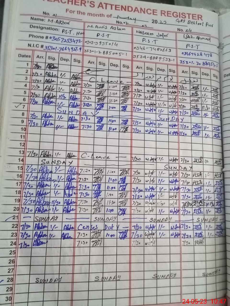 | CNIC | Full Name | Designation | R/C | Absence during last cal. month |