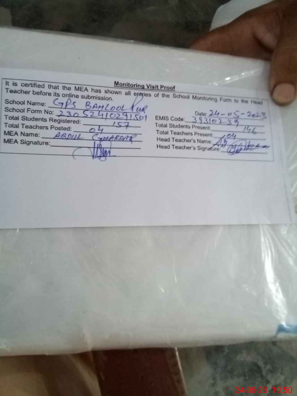 | Attendance Register | Head Teacher | MEA with School | Visit Proof |