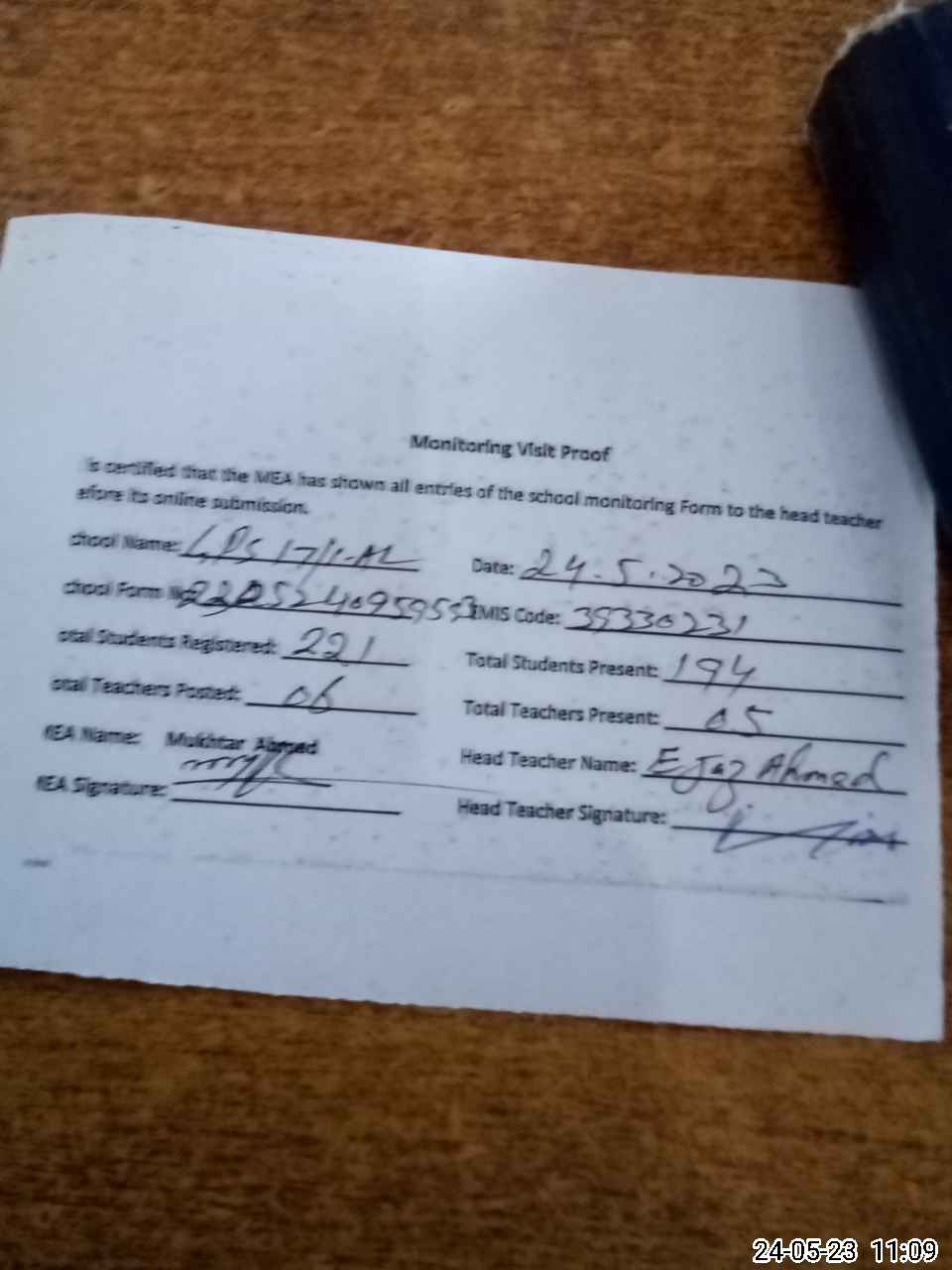 | Attendance Register | Head Teacher | MEA with School | Visit Proof |